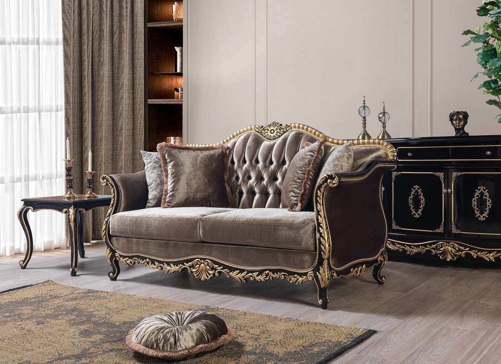 In a modern black, gold, and light green colorway, the Betria loveseat is both contemporary and timeless. Gold paint accentuates the carved details against the shiny piano black foundation. Silky smooth light green velvet upholsters this loveseat. Perfect in a formal living room setting to impress your guests. It includes throw pillows in contrasting fabrics.
