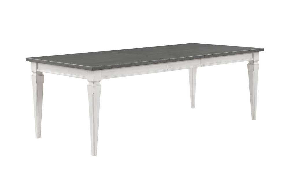 This Katia dining table strikes a balance between casual and chic. The gray and weathered white finish is a classic combination that will go with all decor styles. This table features a gray tabletop and a weathered white base, with an extension leaf that will allow you to accommodate more dinner guests. This table will help create a welcoming feel to your dining room where you will be hosting guests and making memories for years to come.