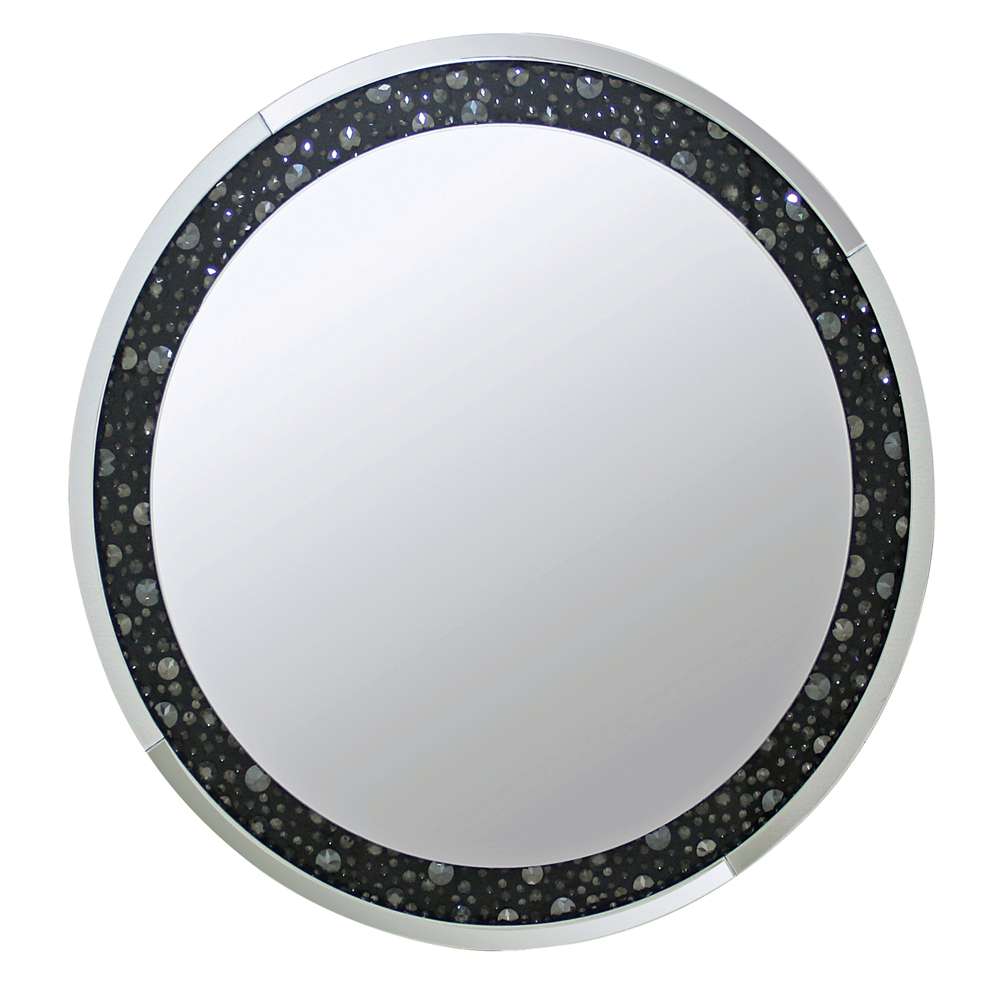 The Noor mirrored wall accent mirror is sure to be the focal point of any room. Dramatically cast with a contrasting black framed background with black crystals. Faceted optic glass crystals adorn the skill layering it with added luxe and brilliance. To complete the look, a beveled mirrored border frames the piece creating an intricate play of light and refection.