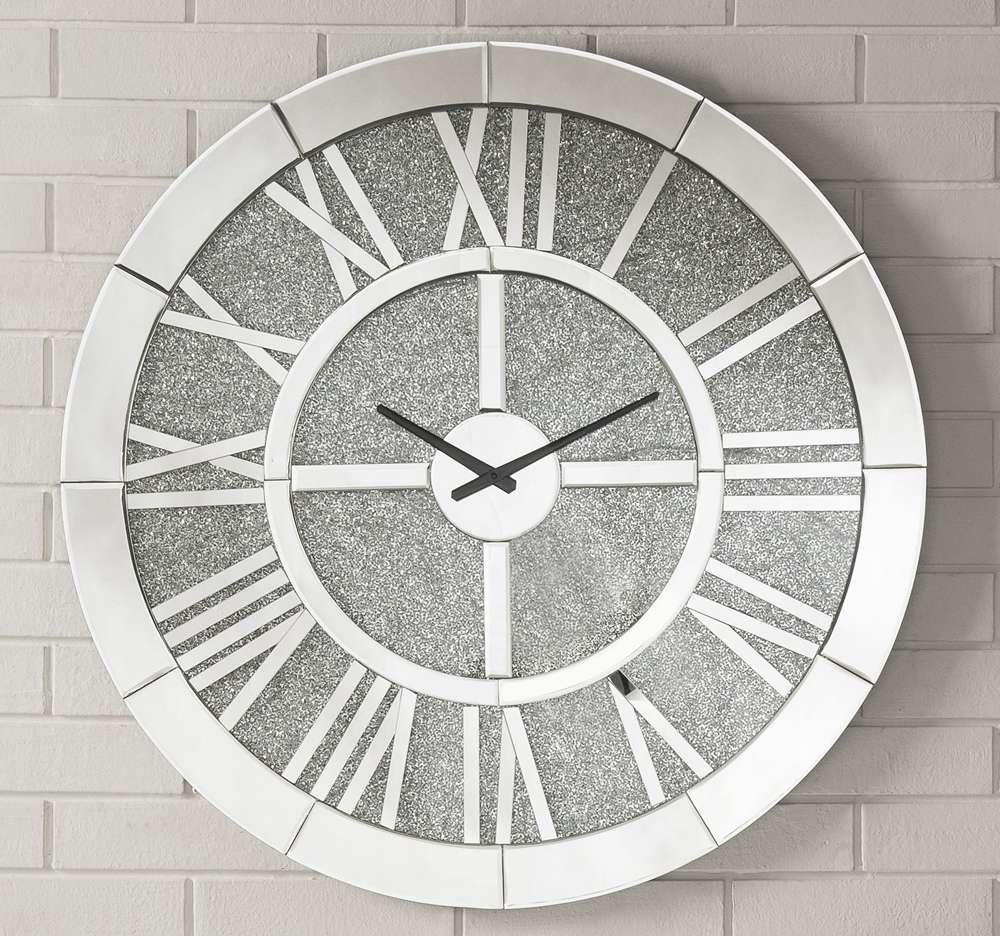 This Nowles round wall clock is covered in beveled mirrored panels that highlight its glamorous style. Featuring crushed acrylic faux diamonds that will naturally attract the eye. Durable engineered wood supports the frame. The clock face comes with a timeless roman numeral design.