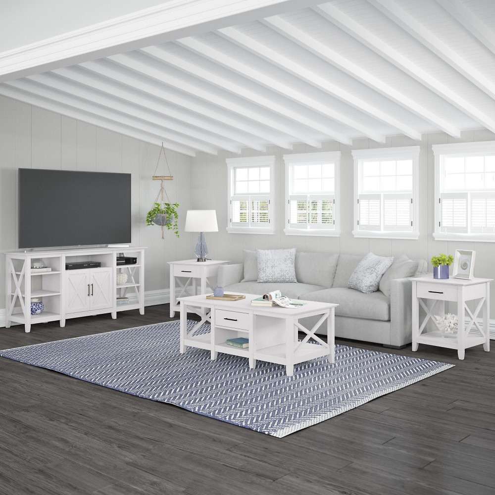 The Bush Furniture Key West Tall TV Stand with Coffee Table and Set of 2 End Tables is a perfect way to bring the feel of a coastal retreat right to your living room. Highlighted by unique X pattern accents and your choice of several casual finishes, this furniture set is a natural fit in homes that embrace cottage and farmhouse styling. Get together for movie night or catch up on your favorite show around an entertainment center that supports up to a 65 inch television and/or 75 pounds. An upper shelf with a cable management cut out provides an ideal place to keep your DVD player or video game console. A closed cabinet and open storage areas on either side offer more than enough space for movies, games and other media essentials. Each side of the low Coffee Table features a box drawer above an open cubby for organizing books, magazines and other miscellaneous items. Larger compartments to the right and left add plenty of room for decorations or additional storage. The side tables also include a drawer for small accessories like TV remotes, writing utensils and notepads while the surface easily supports a lamp, plant or pictures. This living room table set has been rigorously tested to meet Bush Furniture's standards for safety, performance and durability and is backed by a 1 Year Manufacturer's Warranty. Browse the full Key West Collection for home furnishings with easy going style.