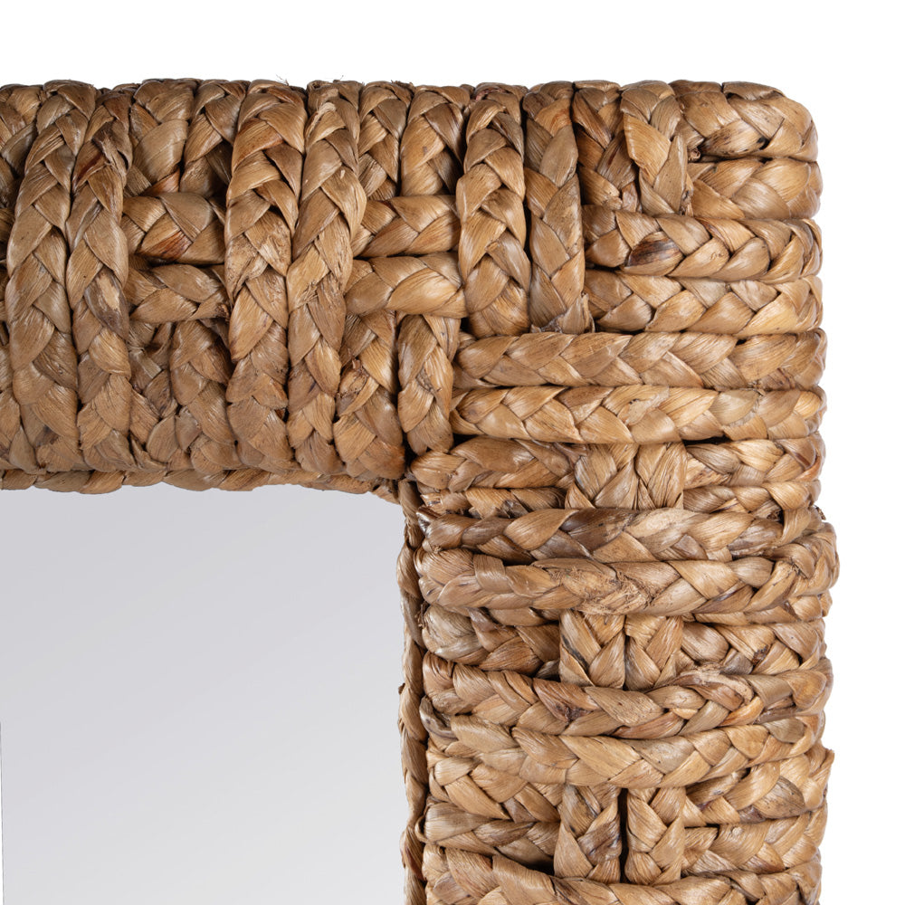 - Mirror constructed using water hyacinth woven over plywood substrate and half-lap joinery with a glass font.