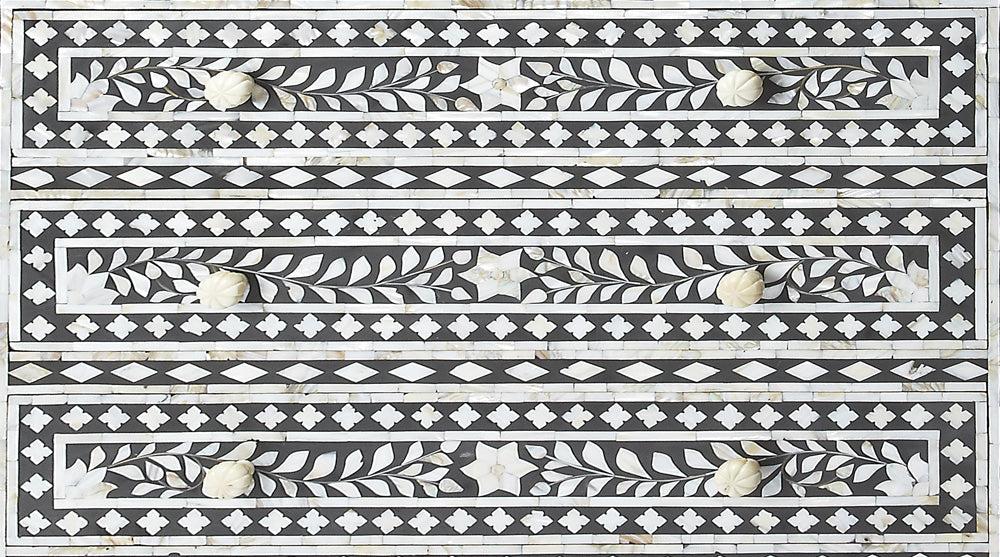 Sophisticated artistry and craftsmanship go into the detailed botanic and geometric pattern on the drawers, top and sides of this delightful Butler Specialty Company chest. White mother of pearl inlay individually cut and applied against a black background make each dresser a bonafide original. The chest boasts three storage drawers , ideal for a child or teenager's room and equally at home in the dressing room or sitting room.