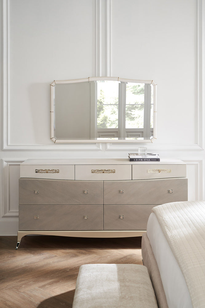 Wrapped in an elegant, Alabaster-painted faux shagreen, the Aria mirror introduces a note of refinement in any interior. Features a softly curving arch along the top, with a beautiful beveled edge for added reflection and metal inlays in a Whisper of Gold. Perfectly sized to hang above a dining room buffet, hallway console or dresser.