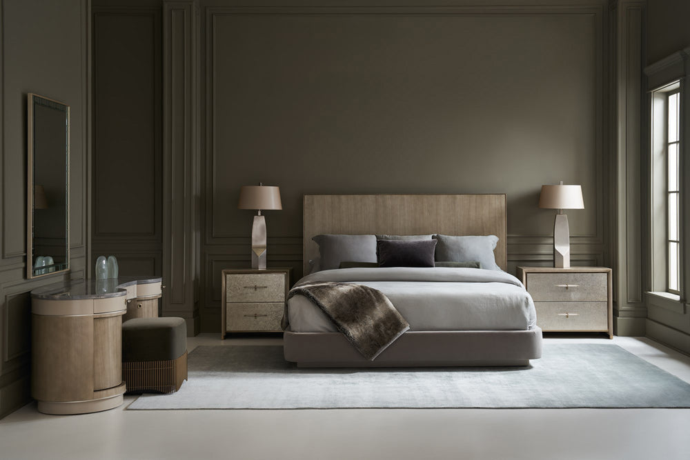 A captivating bedside companion, the Hang Up small nightstand melds the natural beauty of wood with the allure of metal. Features soft-close drawers finished in a broken leaf metallic that recalls the shimmer of a frost-covered, candle lit window. Brushed Gold accents and tapered drawer pulls wrapped in hand-stitched, faux leather add warmth and a luxe finishing touch. Style in pairs, or with our Hang Up large nightstand for added interest and dimension.