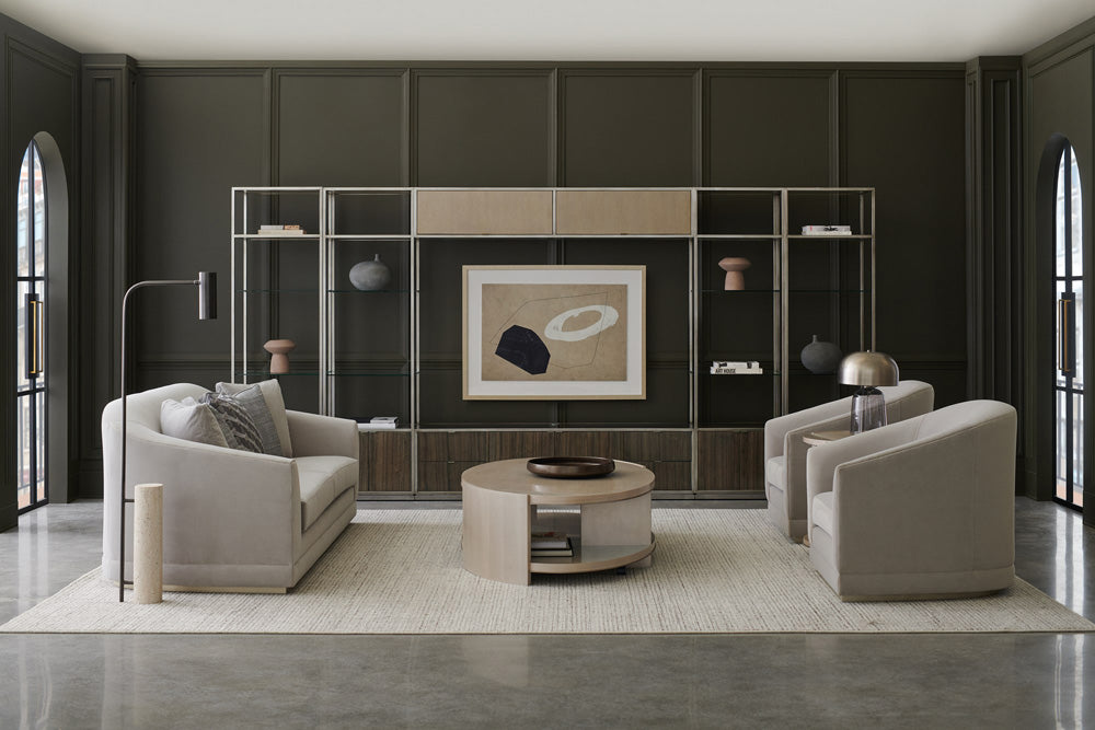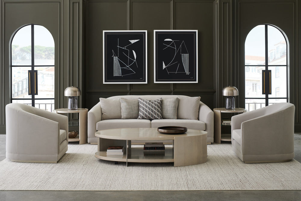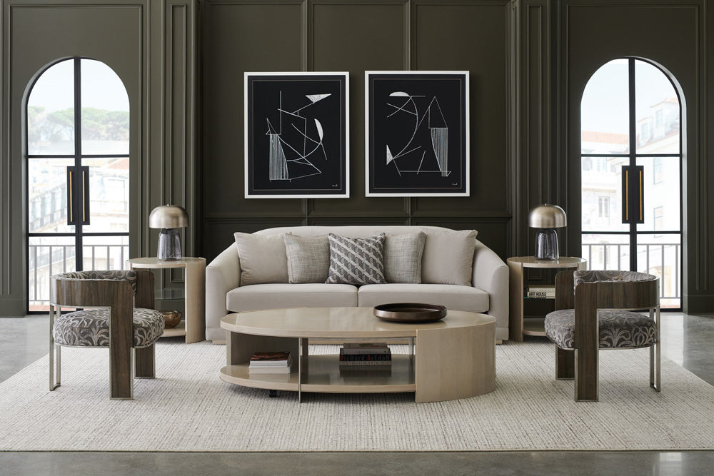 With a refined oval shape and subtle radiance, this cocktail table is a captivating addition to living interiors. Elevating its simple form, a Thunder finish gives light to the linear wood grain, accentuated by metal trim in Soft Silver paint. Like a work of art, every view brings a different perspective, with meticulously designed space for displaying books and collectibles. Hidden casters allow for ease of mobility.