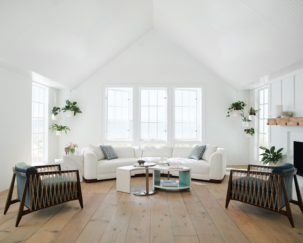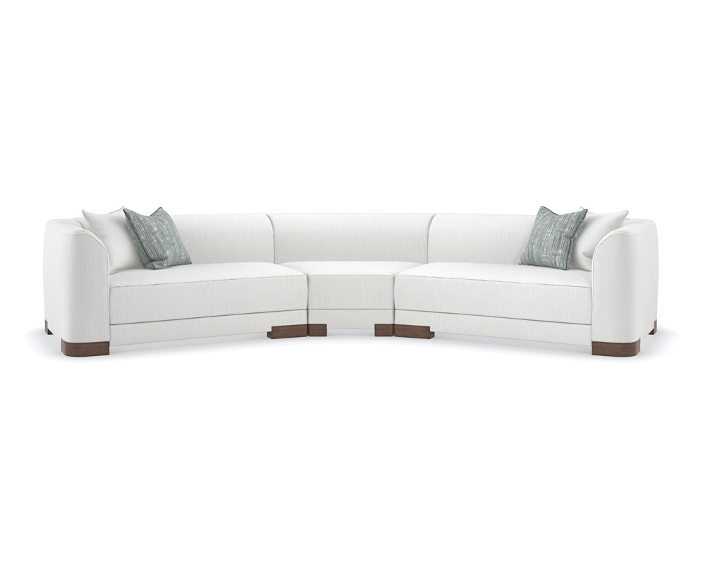 With multiple configurations to create a luxury lounging experience, this modular sectional sets a tranquil tone in a softly textured chenille performance fabric. Balancing clean lines with a subtle curve and rounded edges, its smooth silhouette rests on exposed wood feet in a warmly contrasting French Roast finish. Accent pillows add a tactile finishing touch in an aqua ottoman weave and a tone-on-tone woven geometric.
