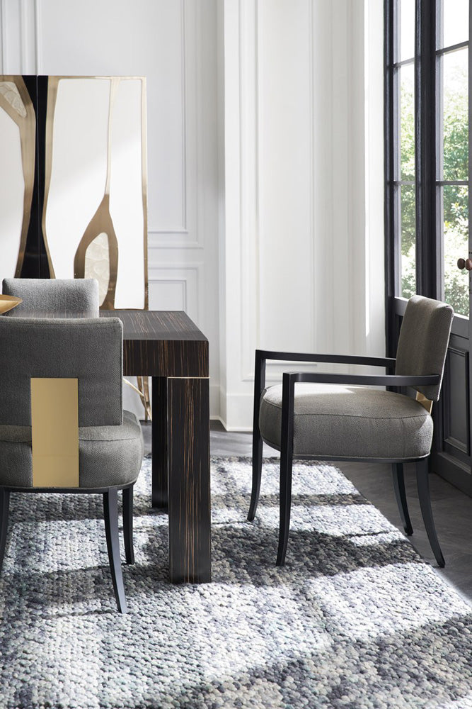 With the utmost attention to detail, craft and functionality, this tall cabinet evokes the rhythmic flow of traffic in and around a city. Oversized doors are framed in a Chocolate Truffle lacquer and finished in a tactile mix of faux shagreen and Cafà © Latte hand-printed resin with a Brushed Gold overlay. Its lit, mirrored interior offers ample space for keeping entertaining essentials, with multiple drawers.