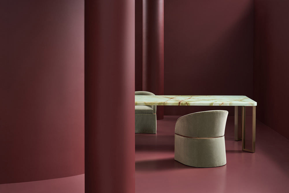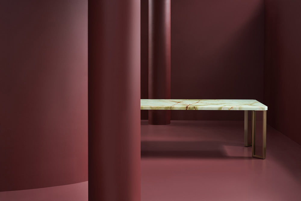 This stunning dining table has nature as its focal point. It irresistible and provides an amazing backdrop for an exquisitetablescape curated with an artful collection of china, silver, glassware and decorative accessories. It is equally as beautiful set fora contemporary business meeting. The sleek Green Onyx top is positioned on contemporary, offset, Brushed Gold legs inset with smoked bronze glass adding an airy lightness to the table. At 100 inches long, it comfortably seats eight people for a sophisticateddining or meeting experience. Consider this awe-inspiring table not only for a dining room but business setting.
