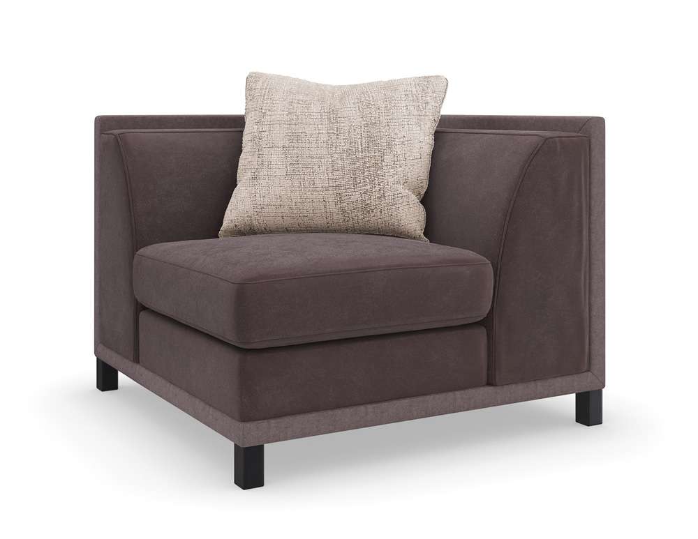 A fashionable component of our classic shelter arm sectional, with clean lines and crisp tailoring in a deep chocolate brown hue inspired by modern takes on the iconic tuxedo. Impeccably dressed, its sophisticated silhouette is punctuated by a luxe faux mohair fabric on the inside, and a textured woven fabric wrapping the back. Metal legs in brushed deep bronze add warmth and a dashing finish, complemented by accentuating toss pillows in a tactile mix.