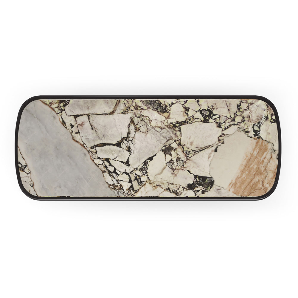 The Vena Dining Table is a showstopper. This piece celebrates Calcutta Viola stone with its richly figured veins in plum, burgundy, inky browns and blacks. The stone is trimmed in hand-applied Tupelo veneers in a dark Otter Gloss finish. The top sits on a sweeping Brushed Gold metal base.
