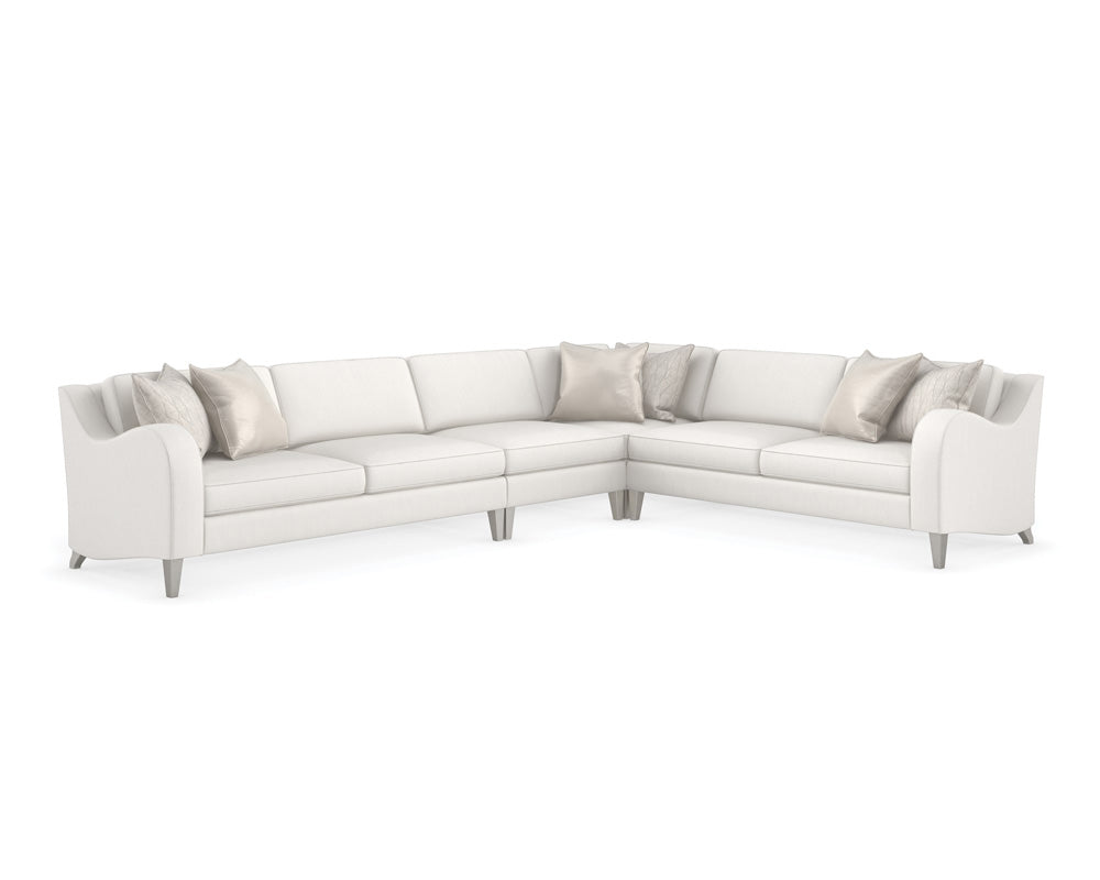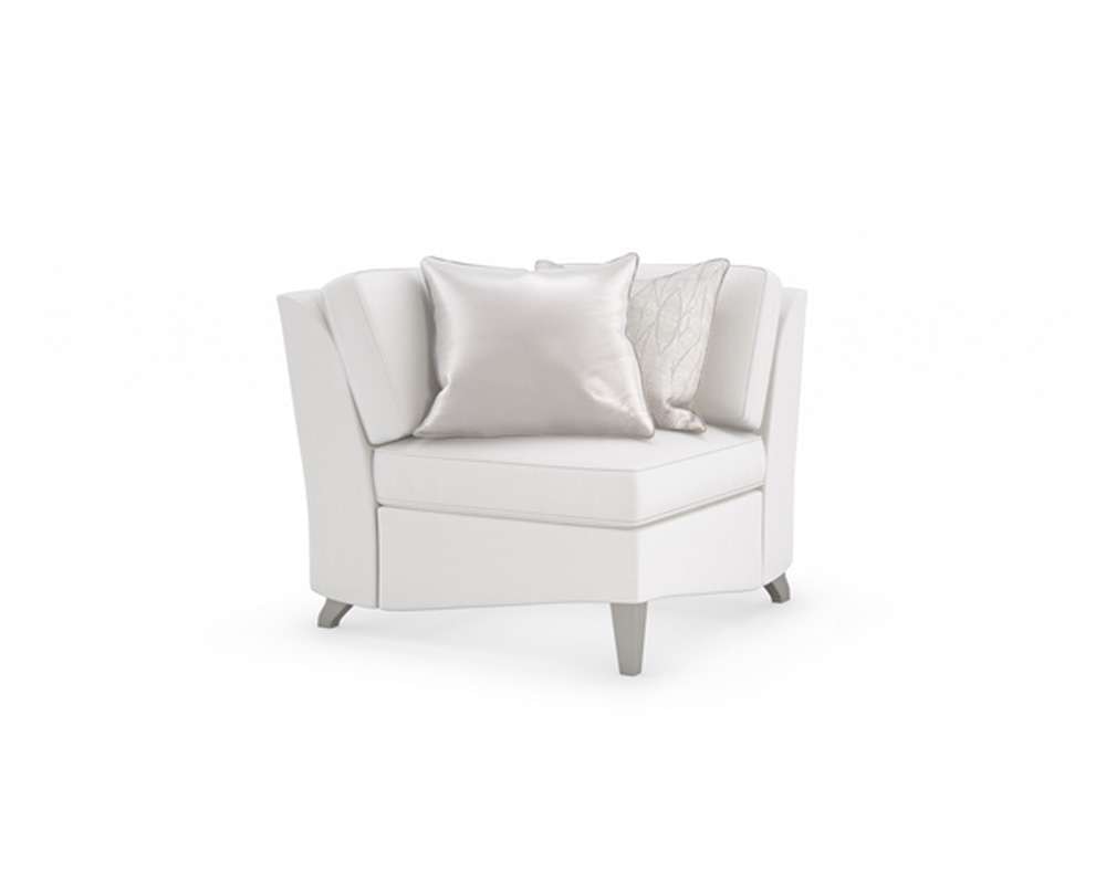 Inspire sparkling conversation and moments of reflection with this shapely sectional, upholstered in a cream performance basketweave with a subtle luster. A fresh, yet familiar addition to living room interiors, its gently sloping arms lend a contemporary take on the classic English arm, complemented by tapered legs in a Sparkling Argent finish. Accent pillows add shimmer and tactile appeal in a botanical leaf print and gold-toned satin. Sofa and chair also available.