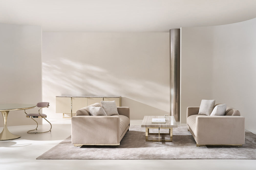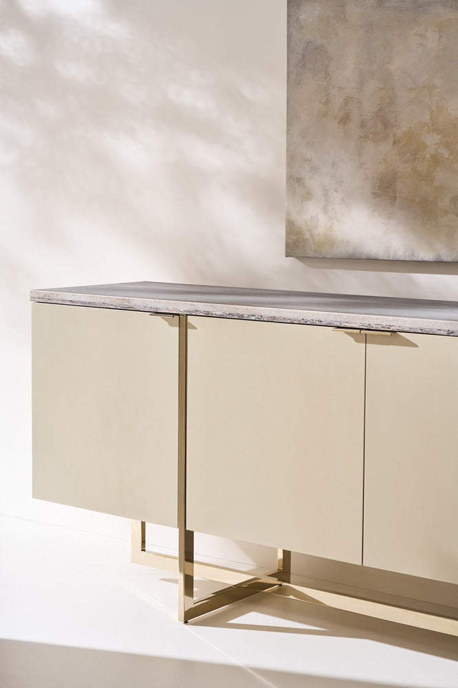 Stone, mirror-polished metal and hardwoods crisscross in this sleek media cabinet with linear appeal. Flowing Sandstone graces the84 top of the Pearl-painted cabinet and four doors. The paint gives off just enough luster to make the piece intriguing. The doors have slim Whisper of Gold pulls. Adjustable shelving and wire access graces the inside of the cabinet. The base is the real stunner of the piece with thin intersecting bars in mirror-polished Whisper of gold that overlap each other and extend up the cabinet to add interest.