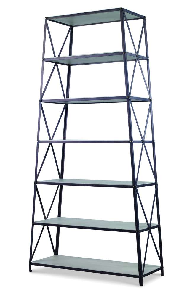 Inset painted shelves and small, careful details like brass rivet heads on metal strapping are important finishing touches that let this statement piece move easily between upscale interior and casual use.