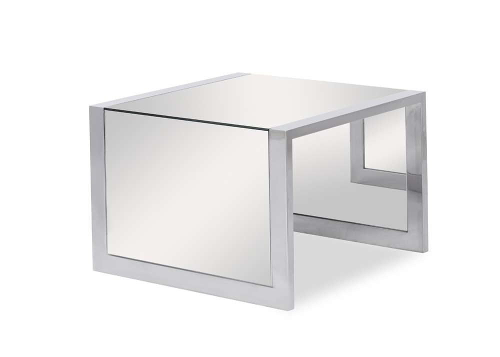 A modern bunching cocktail table crafted of polished nickel metal and mirrored glass panels, the Adrian Bunching Cocktail Table is a beautiful form that can be used in a myriad of ways. Two smaller tables nest side by side underneath the larger waterfall table and can be pulled out and used as side tables or just an extension of the cocktail table surface to give Adrian even more places to set a tray of drinks or hors' d'oeuvres.