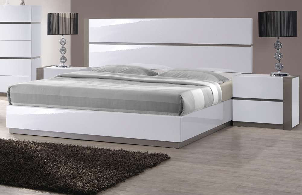 A sleek, modern platform bed, featuring a sturdy medium density fiberboard construction and a matching moisture-resistant high gloss 2-tone white and gray finish.