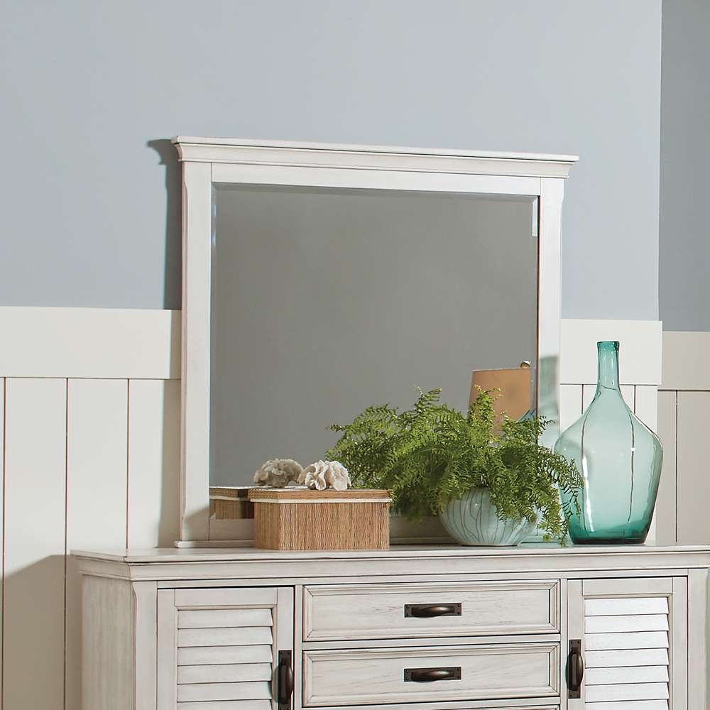 Stylishly transform a rustic space with this classic square mirror. The sleek and smooth silhouette is upgraded with a subtle frame detail on top. Open up a space with the country chic feel of an antique white finish. Create a vanity-inspired look by hanging above a dresser. Slight embossing adds depth to the mirrored glass and reflects brightly throughout a space.
