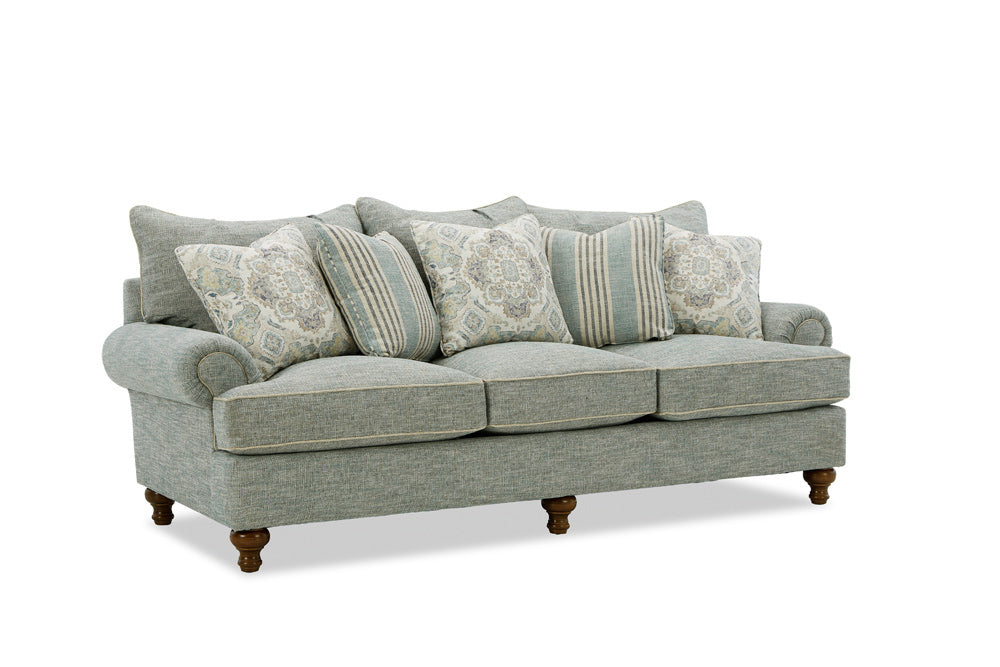 This casual sofa, from the Paula Deen Home collection is one of our favorites. It's easy to see why! For starters, it's a generous 100'' long and features an armload of pillows to curl up and relax on. The loose pillow backs, roll arms, and turned wood legs give it a laid back, casual look that Paula is so proud of! It also features her exclusive Down Blend cushions that wrap you in comfort from the first moment, but will last for years. Also available are the matching loveseat, chair 1/2, ottoman.