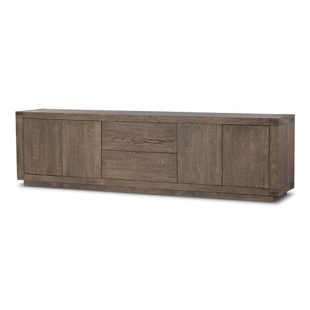 Worn oak shapes a streamlined box-style media console, with lap joint corners for a detail-driven touch.