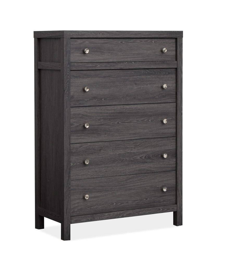 The Merrinwylde Collection boasts a bold Raisin Black finish and with rich undertones that mimic the texture of oak veneer and paired with sleek polished silver hardware to elevate its modern appeal. The casegoods feature minimalist lines and a sophisticated multi-dimensional finish and creating a clean and contemporary look that blends effortlessly into any modern bedroom. Perfect for contemporary interiors and the Merrinwylde Collection's combination of premium oak laminate and hardwood solids and and polished silver accents will transform your bedroom into a stylish and modern retreat.