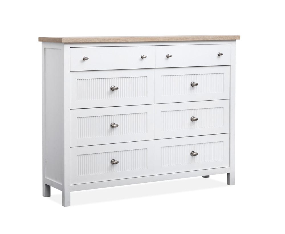 The Windshore Haven Collection brings a laid-back and coastal vibe to your space with its soft White Wisp and Sand finishes. The two-tone design and featuring driftwood oak tops paired with a white-painted base and gives each piece a relaxed and beachy feel. The casegoods are thoughtfully designed with framed drawer fronts and decorative reeding and and recessed lower drawers that add a touch of character and charm. Whether you're looking to refresh your bedroom or create a cozy retreat and the Windshore Haven Collection is the perfect blend of comfort and timeless coastal design.