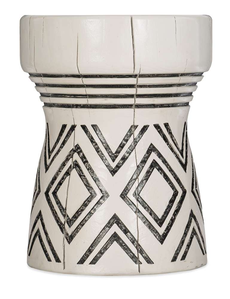 Crafted with cast resin in a design to portray nature aged roots, the Carved Stump Side Table is hand-painted with a bold black geometric tribal print on a creamy white-colored background.