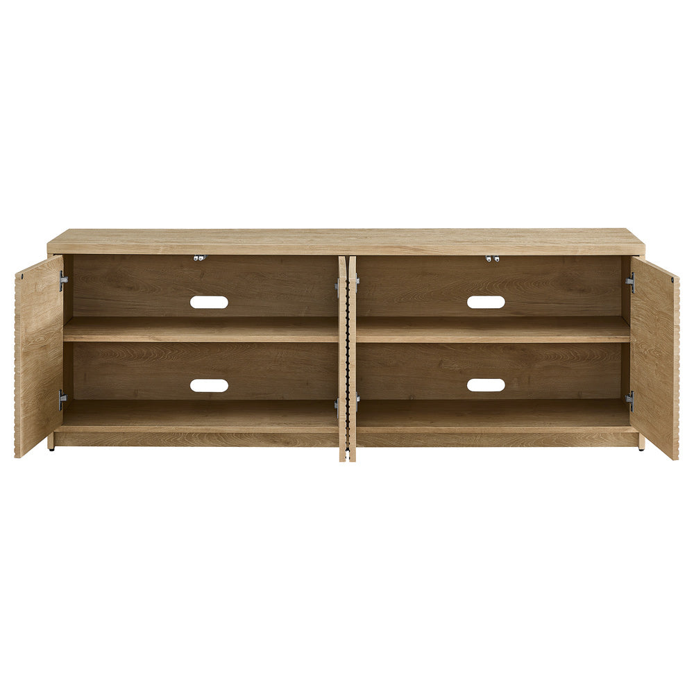 On-trend texture and design combine in this transitional TV stand. With a wood grain finish and wide-channel slatted details, this piece is sure to be a statement in your living room, den, or game room. The recessed plinth base gives an illusion of a seamless transition from your floor, while the hardware-free front panels create a modern minimalist look. The console features 4 fully enclosed doors with adjustable inner shelves and cable management cutouts, allowing for ample storage for your devices, games, books, and more.