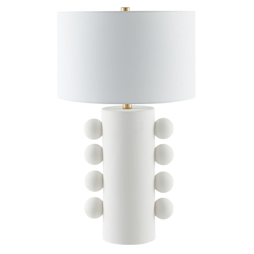 The bold silhouette of this table lamp is sure to become a focal point in your living room, bedroom, or workspace. The gently curved lines of the matte ceramic body are punctuated with spherical orbs on each side, creating a textured, sculptural look. The fixture is finished off with a simple drum shade, allowing the unique shape of the base to remain the star of the show. Create a striking style moment in any room!