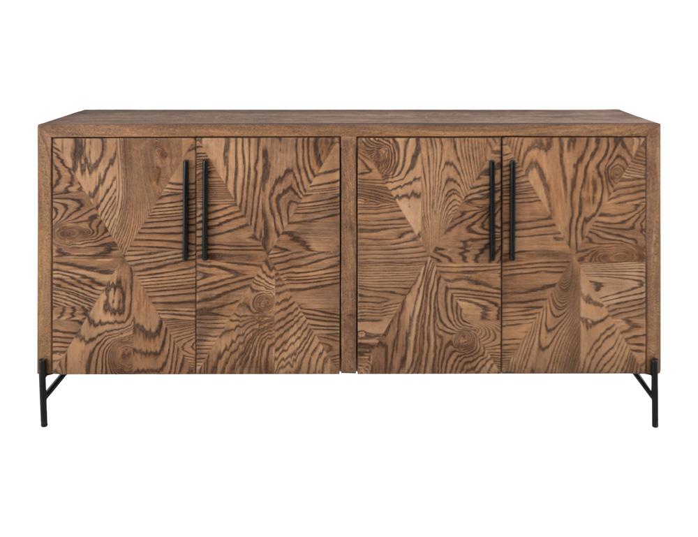 The Verona console combines sculptural elegance, making it a versatile addition to any space. Constructed with a solid mango wood frame and mortise-and-tenon joinery, it offers both strength and artisanal quality. The doors and top are made from engineered ash wood, featuring a bold geometric pattern that showcases the natural wood grain. In contrast, the slim metal base adds a contemporary touch. Custom metal pulls provide a subtle yet refined finishing detail. This console also features an innovative storage solution, complemented by four shelves designed for optimal organization and style.