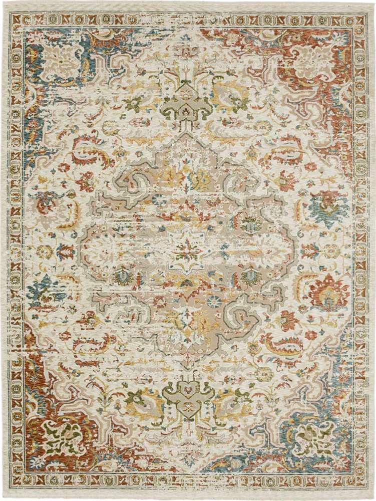 A traditionally inspired ornamental medallion design is cast in a neutral backdrop with pops of bold color in Karastan Memento Area Rug Collection. Machine woven with premium polyester yarn; this area rug collection features a plush pile with subtle fringe accents that makes a luxurious statement in any space. The resilient polyester offers sumptuous softness and rich colors with dependable durability designed to thrive in high-traffic areas. Available in popular sizes such as 5x8 and 8x10, this area rug collection is a great choice for adding style to a variety of spaces in your home. Imported from Turkey.