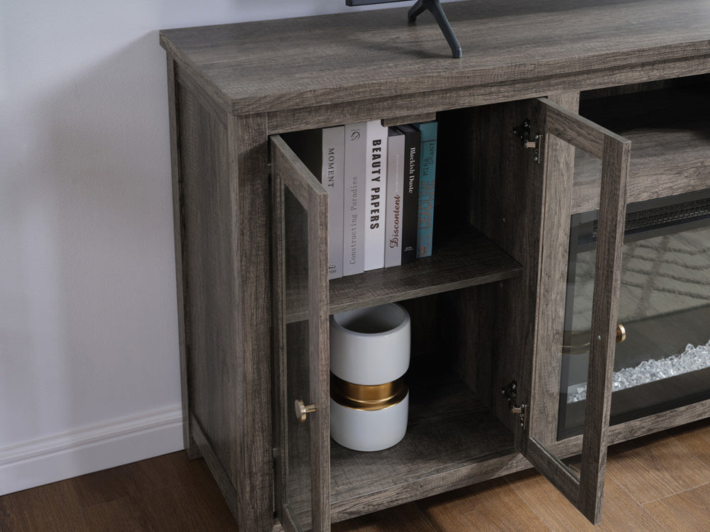 Lilola Home - Ellington 70"W Gray Walnut Finish Fireplace TV Stand Console with Heater, LED Light, Cabinets, Shelves - 97040