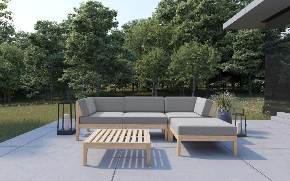 Luxurious Contemporary Styling Creates Your Own Spa Getaway. This 4 Piece Sectional Is At Home Pool Side Or In The Living Room, Providing Comfort And Elegance Wherever Desired. Natural Finished Acacia Wood Coordinates With Grey Performance Fabric Cushions That Comfortably Stand Up To The Weather. Ottoman Creates A Chaise Lounge That Works At Either End.