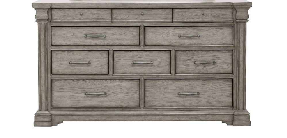 The bracket feet and charming pillar details hint at this 10 drawer dresser's inspiration: an elegant antique hearth. A row of slender top drawers glide out to reveal felt bottoms - ideal for delicate items like jewelry or wristwatches. The rows below offer two slender drawers, three mid-size drawers, and two large drawers on the bottom with cedar panel details. Custom drawer pulls are finished in a charming antique silver that plays off of the soft grey finish and brown undertones in the flat-cut oak veneers. This dresser can be paired with the matching mirror, sold separately, to offer a complete storage and dressing solution for your bedroom.