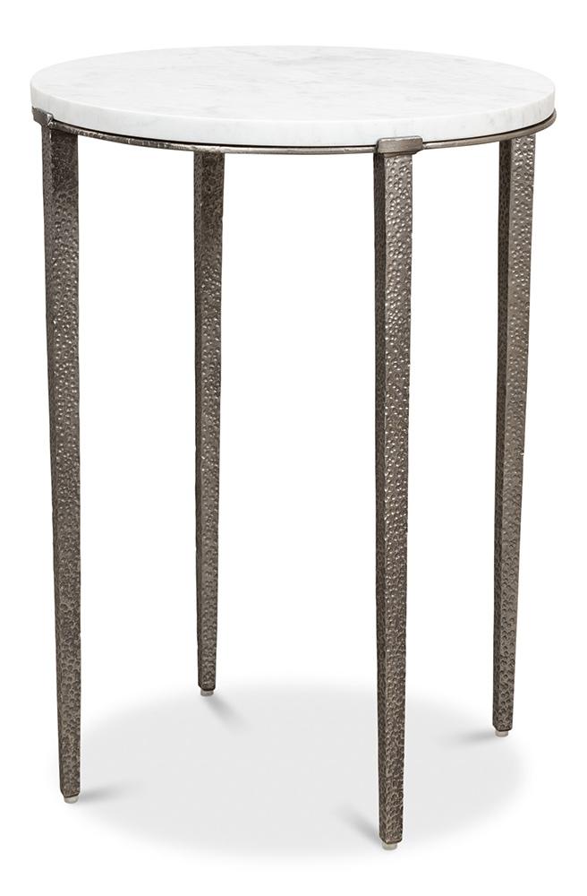 We have managed to make iron take on a very delicate look on the thin, tapering legs of this side table. Beautifully combined with the white marble top. Upscale townhouse.