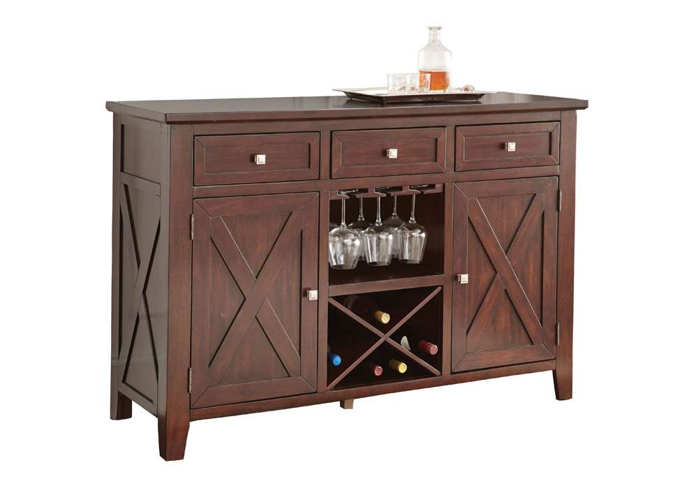 The look of the Adrian Server is unique and modern. The server is crafted of hardwood solids and primavera veneers, and boasts a hand applied espresso cherry finish. Features include 3 drawers, two cabinets with a shelf and stemware storage plus a removable wine rack. The perfect piece for your entertaining needs.