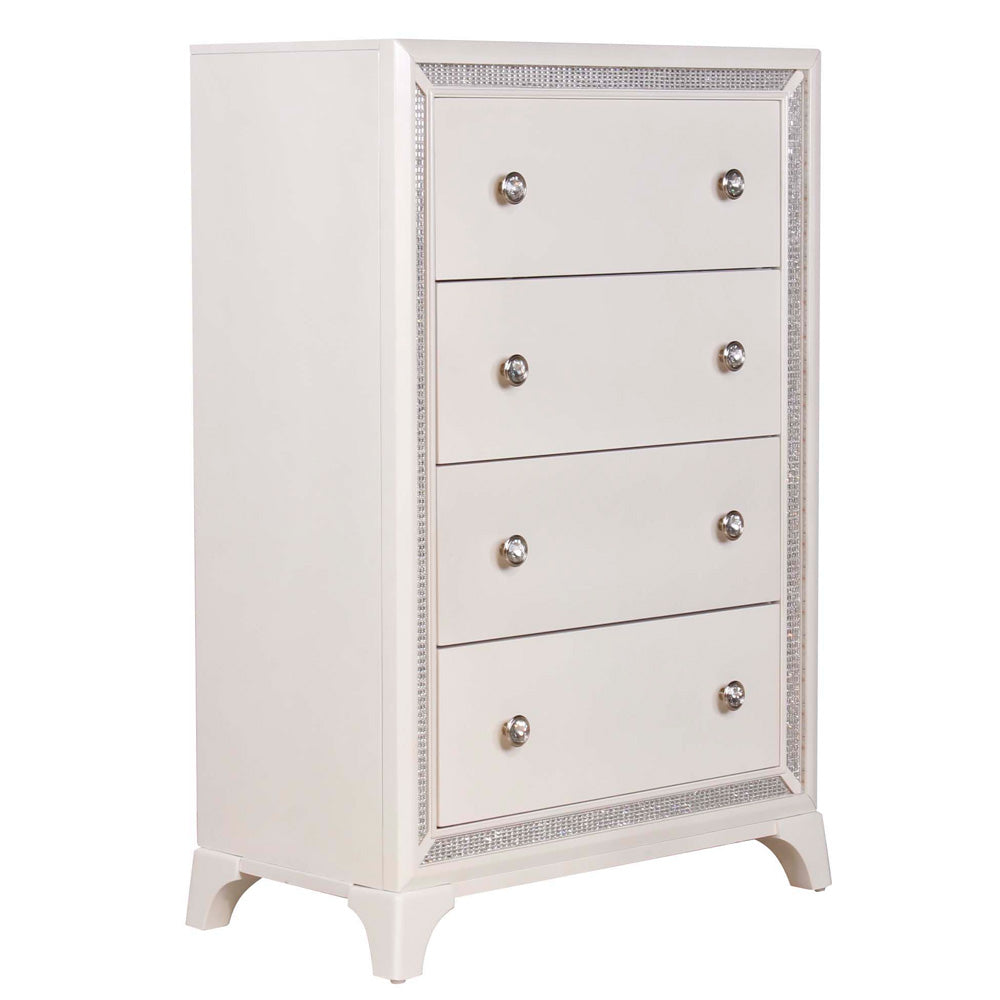 The Cassie 5-Drawer Chest brings ultra-glam style with its shimmering pearl finish and crystal in-laid hardware. Offering ample storage space, its elegant design is complemented by a crystal-inlaid border that illuminates at the flip of a switch, adding a touch of enchantment to any room. Glamorous and functional, this chest elevates both style and practicality in your space.