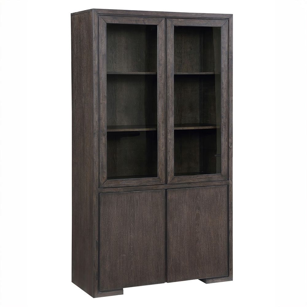 The Evan Curio offers a blend of display and hidden storage with a sleek, modern design. Its clean lines and soft-touch doors create a seamless exterior, showcasing the walnut finish over oak and mango veneers. The wire-brushed texture with a waxy hang-up adds depth to the rich color. Glass doors provide an elegant display for china or decorative items, while the wooden bottom doors offer concealed storage for dining essentials. With its sophisticated finish and functional design, the Evan Curio elevates any dining space with style and practicality.