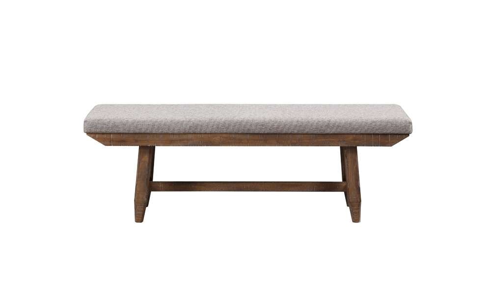 Rustic Ranch styling in a distressed finish with upholstered seat for added comfort. This bench is a full 60 inches in length to to seat up to 4 people and features stretchers for extra strength. A driftwood finish and saw rasping distressing gives the bench a relaxed casual feel that is as comfortable on the plains as it is in the city.