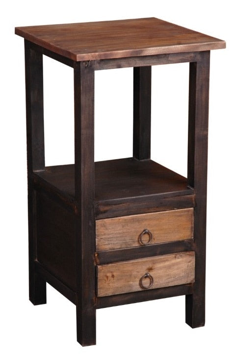 The compact size of this accent table, combined with its double drawer and open shelf, make it the ideal companion to a pedestal sink, small entranceway or den seating. Intriguing two tone wood finish will complement any decor.