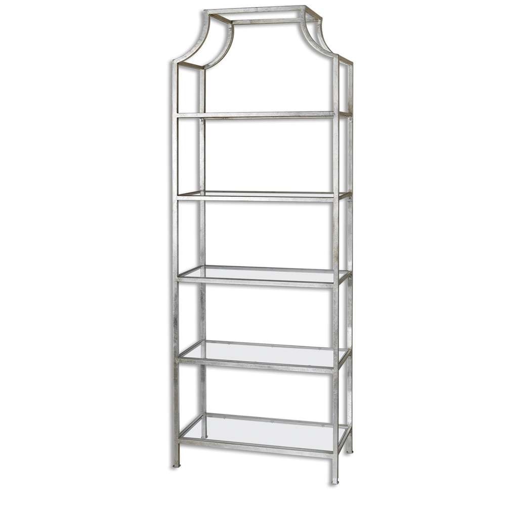 - Finish/Frame: Transitional In Style, This Forged Iron Etagere Features A Bright Silver Leaf Finish With Five Tempered Glass Shelves.