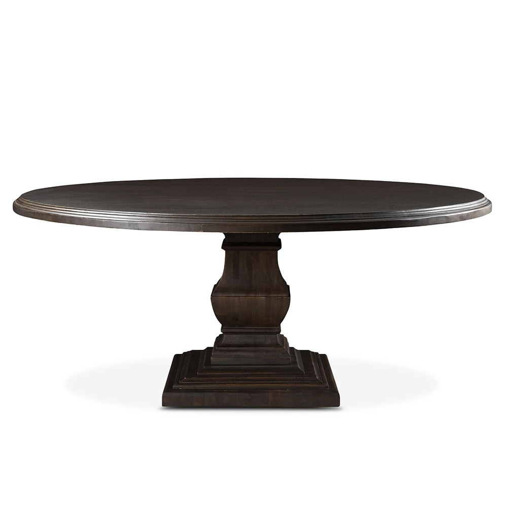 It's all about the details with the beautiful products of the Toulon collection. Each piece starts with a rich, vintage brown finish over solid mango wood, and features accents like thick multi-layered pedestals and triple beveled waterfall edged table tops, resulting in a traditional yet contemporary look. The fine details of this collection truly bring to life an elegance not easily found. This beautiful round dining table with vintage brown finish pairs perfectly with any solid wood or mixed media dining room decor. The quality construction enhances the durability and beauty of the table, while the presence of natural wood knots and markings bring out the distinct characteristics of this wood, making no two pieces the same. Perfect for both casual and formal dining, this table can fit 8 seats comfortably making it an excellent addition to any kitchen or dining room.